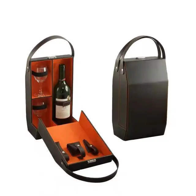 - A portable wine bottle case featuring PU leather exterior and bright white stitching and dependable metal latch that allow for easy and secure wine transport