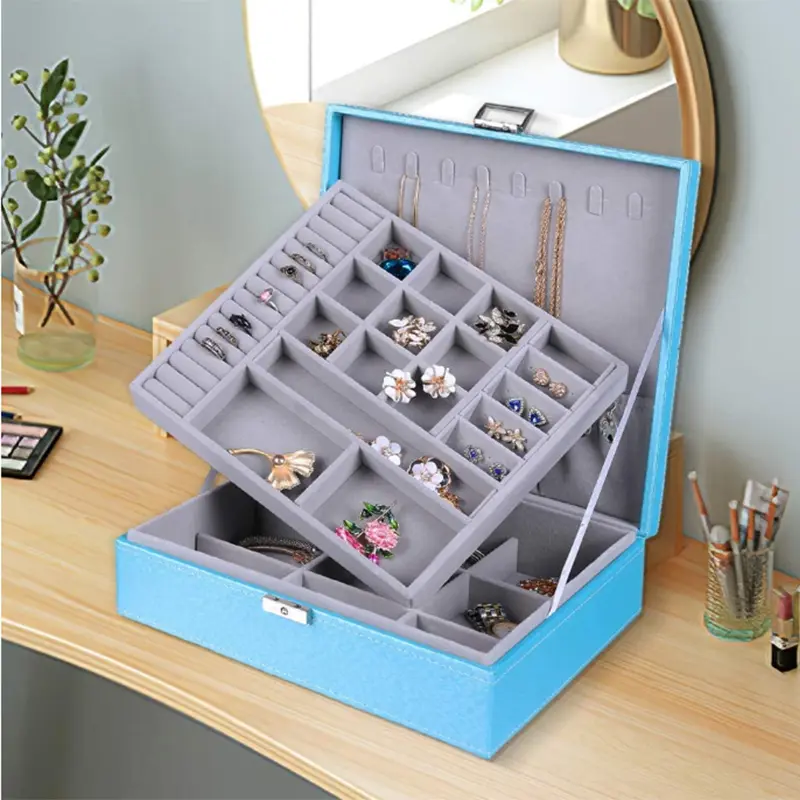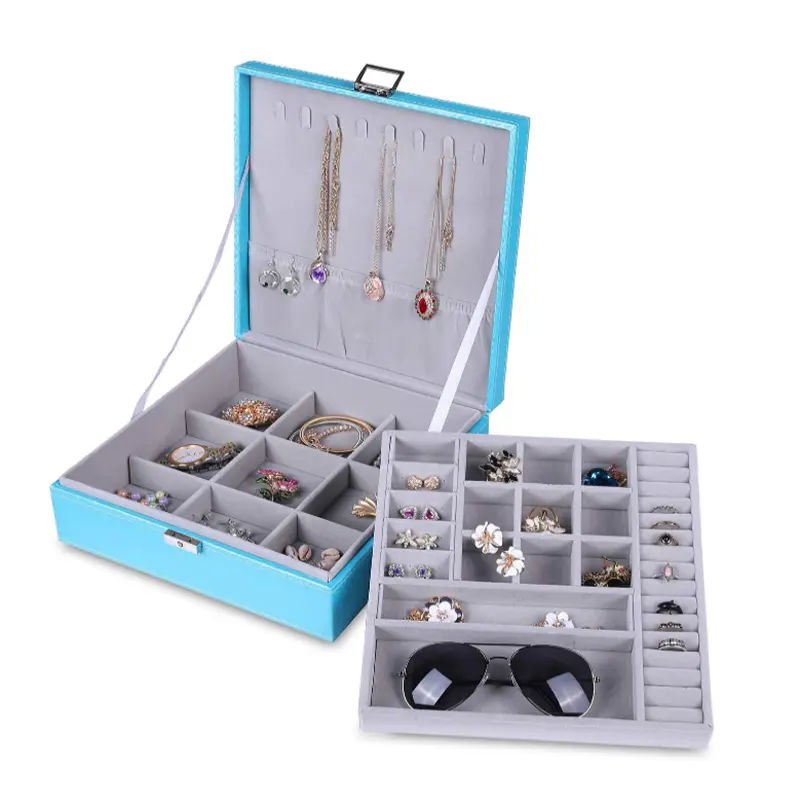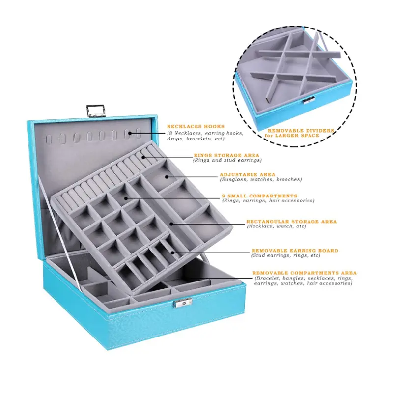 Certainly,this jewelry box is 2-layer multi removable compartments design provides more space and different layout,includes various storage rooms, necklace hooks, ring holder, earring cards and extra removable space.