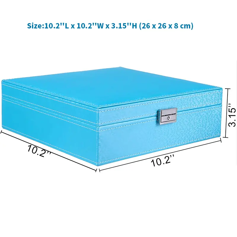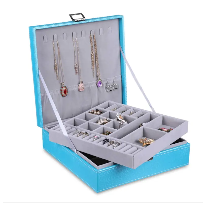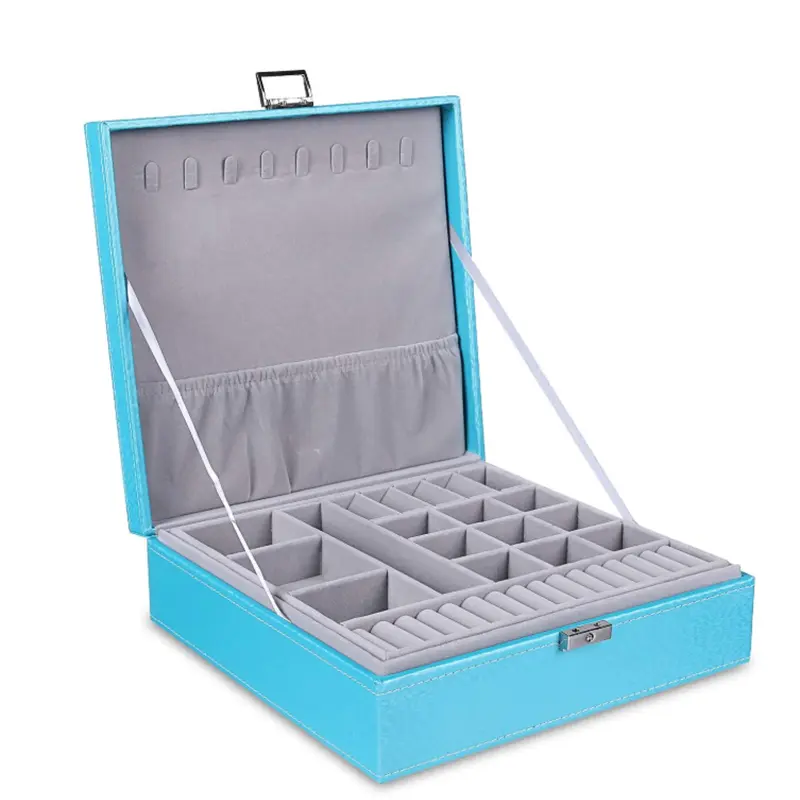 Blue PU leather jewelry box organizer display tray storage case drawer