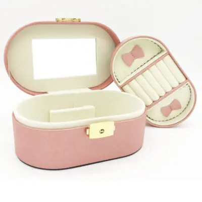 Portable round shape jewelry box is able to store necklaces, rings, earrings and pendant.Built with high quality velvet of suede on the box outside and, soft foam as a insert for more protection the jewelrys, plastic box as the structure,well done stitching,a simple and fashion lid and base box style design.