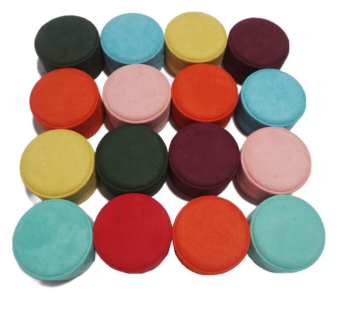 New customized round shape velvet jewelry storage box, high quality and soft velvet, durable paper cardboard with lid and base design,foam inside more protection.